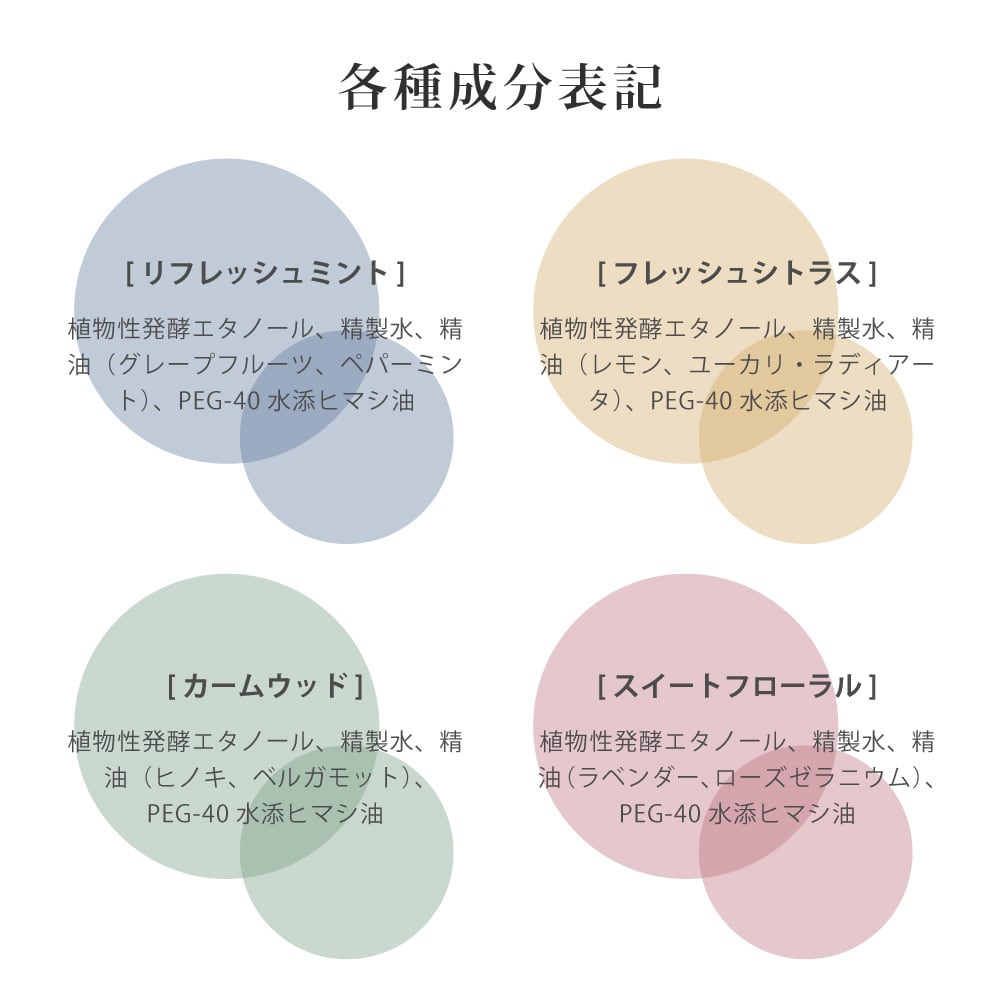 植物性発酵エタノール、精製水、精油(ヒノキ、ベルガモット)、PEG-40水添ヒマシ油
