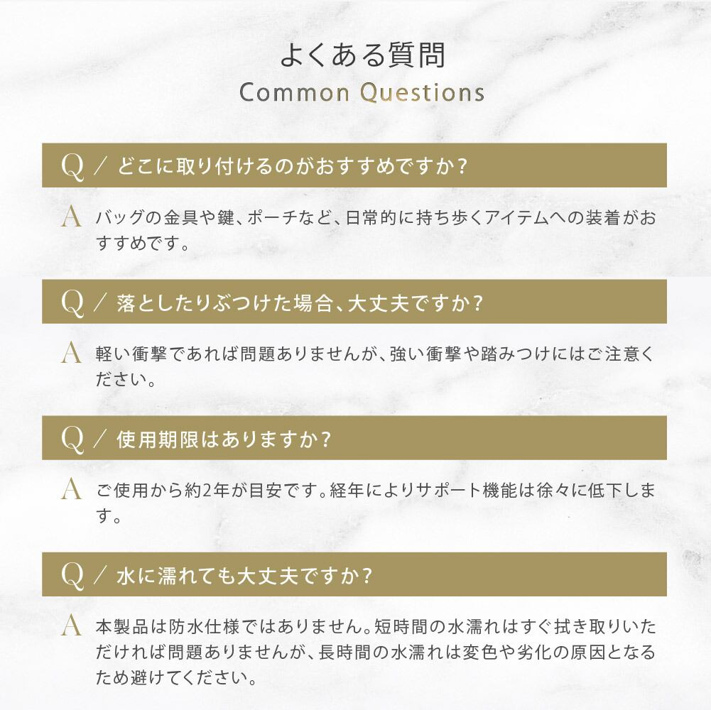 バッグ・鍵・ポーチなど、日常的に持ち歩くアイテムへ取り付けてご使用いただけます。