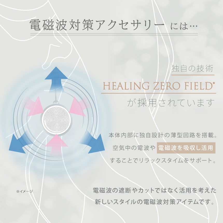 従来の電磁波の遮断やカットとは真逆の発想から開発した独自の技術「HEALING ZERO FIELD®」を採用。周囲の電波や電磁波などを吸収・活用し、リラックスをサポートすることで電磁波の影響(ストレスダメージ)を緩和(防止)します。※上記の特性から5G環境下でも影響なくお使いいただくことができます