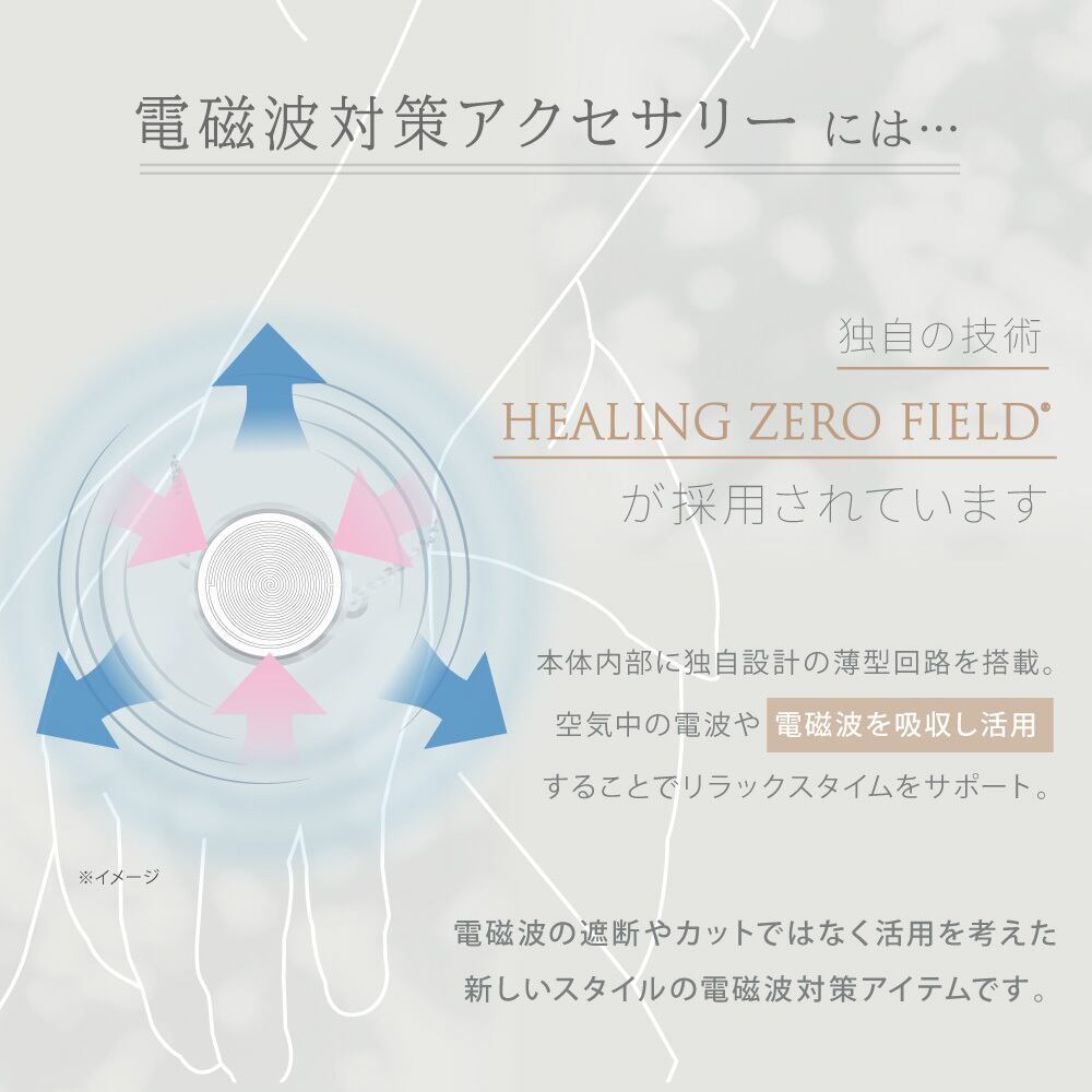 従来の電磁波の遮断やカットとは真逆の発想から開発した独自の技術「HEALING ZERO FIELD®」を採用。周囲の電波や電磁波などを吸収・活用し、リラックスをサポートすることで電磁波の影響(ストレスダメージ)を緩和(防止)します。※上記の特性から5G環境下でも影響なくお使いいただくことができます